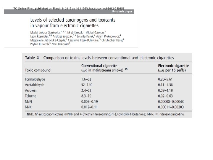 Grupo carbonilo Hidrocarburos aromáticos Formaldehido, Acetaldehido, Acroleina Benceno, tolueno Nitrosaminas Benzopireno Metales Pesados Cadmio, plomo, mercurio Citotóxicos, carcinognéticos, irritantes, enfisema pulmonar, dermatitis Carcinogenéticos, hematotóxicos, neurotóxicos, irritantes Carcinogenético, Hematotóxico, neurotóxico Goniewicz ML, et al. Tob Control 2013; 0: 1– 7. doi: 10. 1136/tobaccocontrol-2012 -050859