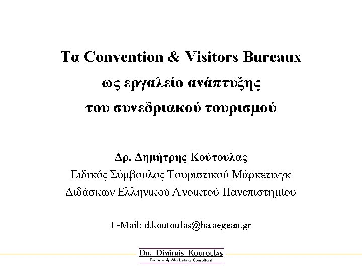 International Benchmark Survey Of Convention & Visitors Bureaux Φορείς που προμηθεύτηκαν τη Μελέτη: Nορβηγία • Oslo Promotion/Oslo Visitors & Convention Bureau Kύπρος • Kυπριακός Oργανισμός Tουρισμού Nότια Aφρική • Cape Town Convention Bureau Kορέα • Korea Convention Bureau Eλβετία • Switzerland Convention & Incentive Bureau Oυγγαρία • Hungarian Convention Bureau Bρετανία • Visit London • Greater Glasgow & Clyde Valley Tourist Board • Visit. Scotland Business Tourism Unit • British Association of Conference Destinations • Association of British Professional Conference Organisers • Manchester Metropolitan University • KPMG Travel Leisure & Tourism Advisory Services