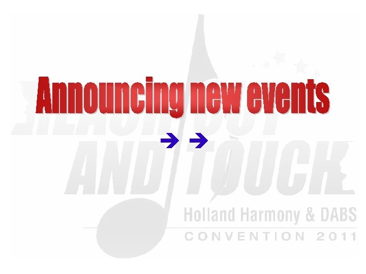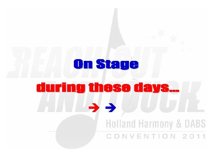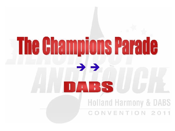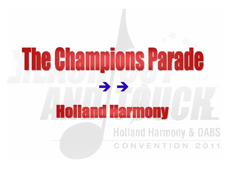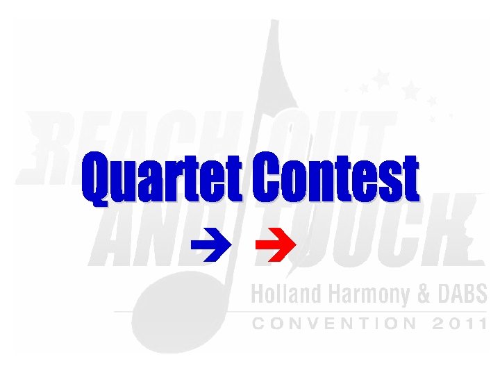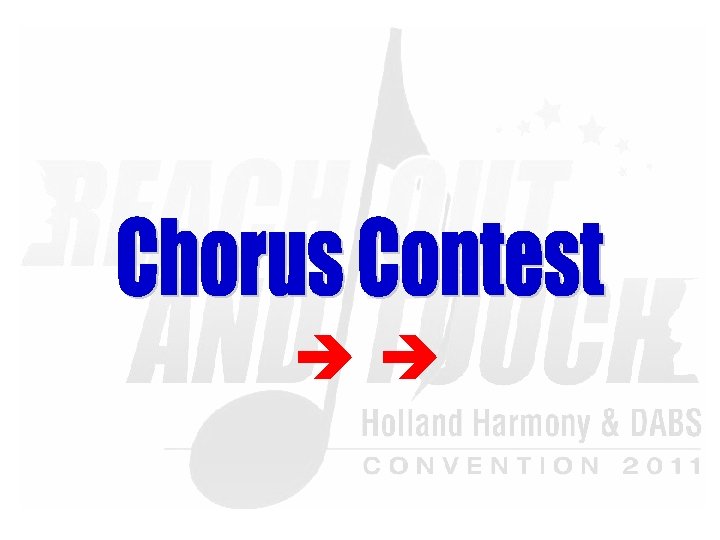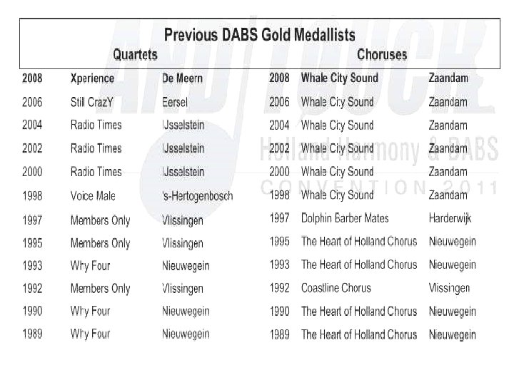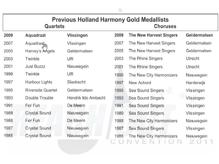 Saturday Evening Show “Reach Out & Touch!” 20: 00 – 22: 45 § § § § § Wildcard Chorus –HH: The Singing Pearls Champion Quartet –DABS: TRADEMARK Champion Chorus –HH: The New Harvest Singers Champion Quartet –HH: . nl Champion Chorus –DABS: Whale City Sound - Break Amersham A Cappella -LABBS Q-tones -SNOBS Safari –SA-NLR Ladies First –Bin. G! Musical Island Boys -NZABS Master of Ceremony: Lenhard van Ballegooijen