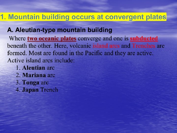 Convergent boundary of two oceanic plates. island arc and a _____. trench Example: _____ Japan Creates an ____