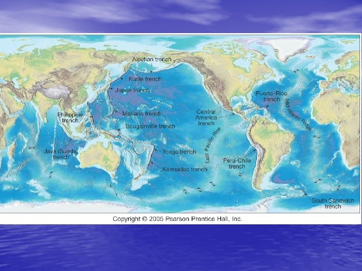 Convergent Plate Boundaries • Older portions of oceanic plates are returned to the mantle in these destructive plate margins • Surface expression of the descending plate is an deep ocean trench • Also called subduction zones • Average angle of subduction = 45 • 1000’s km long, 8 -12 km deep, 50100 km wide.