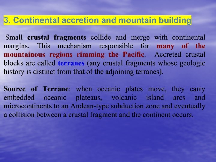 1. at convergent plates 2. at Continental Plates Collisions 3. due to Continental accretion 4. Fault-block mountains