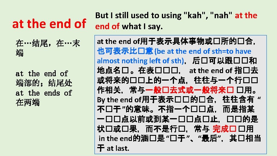 at the end of January 一月底(指一月份的最后一天) by the end of January 一月底之前(指一月份�束前的几天) e. g. ·That treaty expires at the end of this year. ·I noticed a chink of light at the end of the corridor. ·At the end of the interview I was dazed and exhausted. Exercise: the end 1. They were at _______ their patience. of 他们忍无可忍。 by the end 2. We are to complete the task _______the of year.