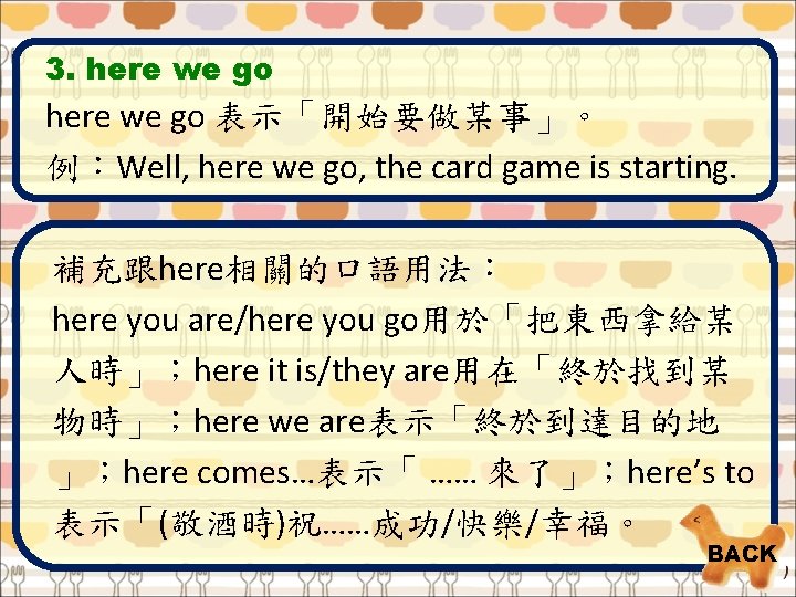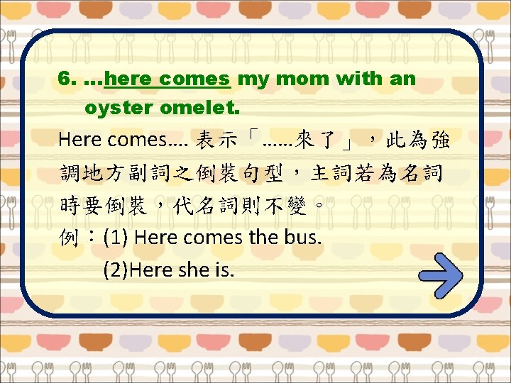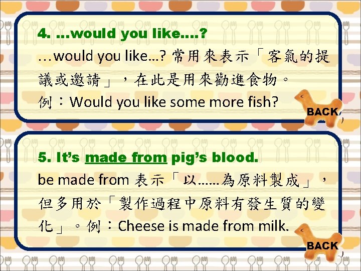 Tips for You 1. tofu [`tofu] n. [U] 豆腐 2. goodness [`G 5 dn. Is] interj. 天啊 3. stinky [`st. I 9 k. I] adj. 發臭的 4. jelly [`d. ZEl. I] n. [U] 膠凍,膠狀物 BACK 5. blood [bl^d] n. [U] 血 6. oyster omelet [`OIst 2 `Aml. It] n. [C] 蚵仔煎