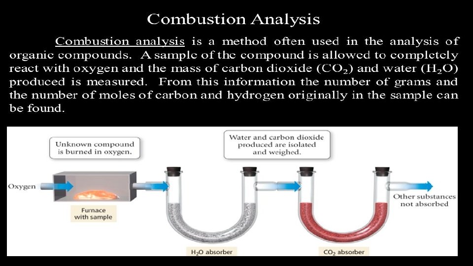 Combustion Analysis • Combustion analysis is another way to determine the empirical formula of an unknown compound. • Especially used to find the empirical formula of compounds containing C and H • When the sample is burned, all the C in the sample is converted to CO 2 and all the H is converted to H 2 O • The CO 2 and H 2 O produced are then weighed