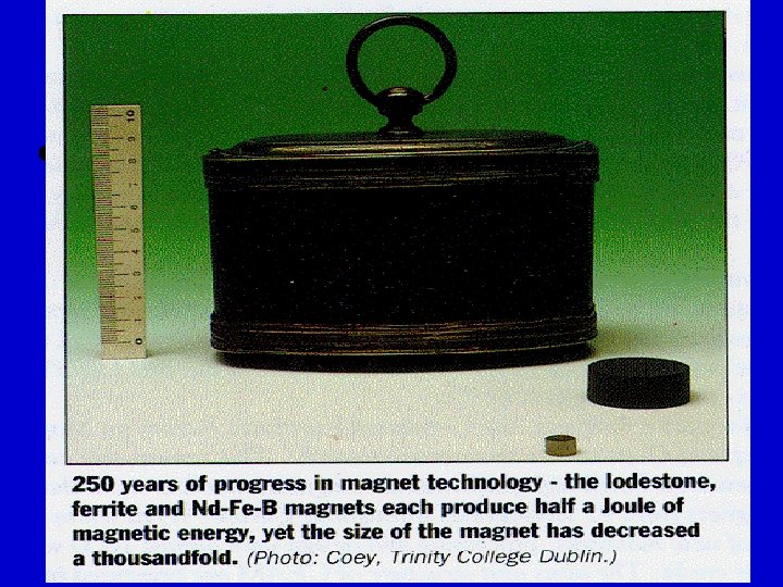 ÍMÃS PERMANENTES • Ímãs de terras raras chegam a atingir 400 k. J/m 3 • O produto energético dos ímãs mais avançados tem dobrado a cada 12 anos • Os ímãs atuais são cerca de 200 vezes mais fortes que os de 1990 • Os melhores ímãs atuais ainda apresentam somente 1/4 do produto energético teórico