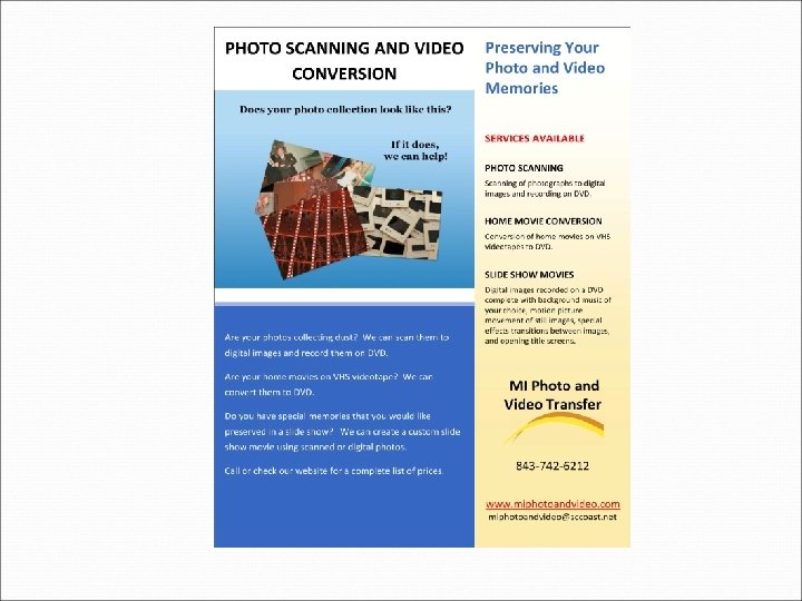 Pricing Transfer VHS Videotape to DVD Base price $24. 99 Custom editing of tape content Available at additional charge Scanning Photos, Negatives, or Slides DVD Slide Show Movies Minimum 50 images $24. 99 Slide show movies $19. 99 Over 50 images (250 max. ) Over 250 images (500 max. ) DVD including all scanned images $49. 99 Copies of slide show movies $5. 00 each $79. 99 No charge