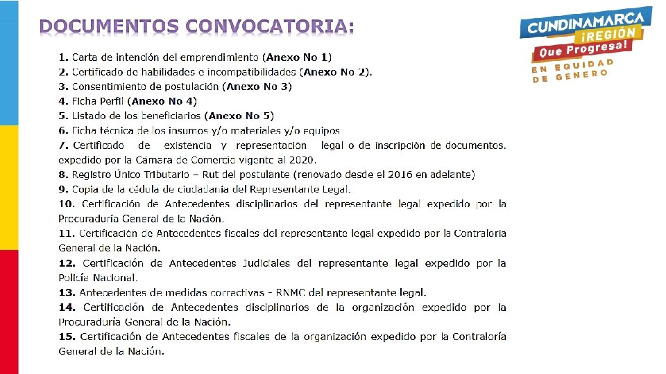 RECEPCIÓN DE DOCUMENTACIÓN Se establece la presentación de documentos obligatorios, se hará por medio magnético: • A través del correo convocatoriamujer#1@cundinamarca. gov. co electrónico: • Asunto: Emprendimiento Nit XXXXXXX – X (corresponde al # de la organización) del municipio de XXXXXX. • Adjuntar los 15 documentos firmados por el representante legal. TENER EN CUENTA QUE: 1. Solo se recibirá un correo electrónico por emprendimiento en el cual se debe adjuntar la totalidad de los documentos que hacen parte de la presente convocatoria. 2. No se aceptarán envíos parciales de la documentación, en caso de ser así se evaluará el primer correo electrónico radicado por la organización. 3. Teniendo en cuenta que la recepción de los documentos se realizara de manera virtual, serán válidas las firmas digitales, sin requerir autenticación