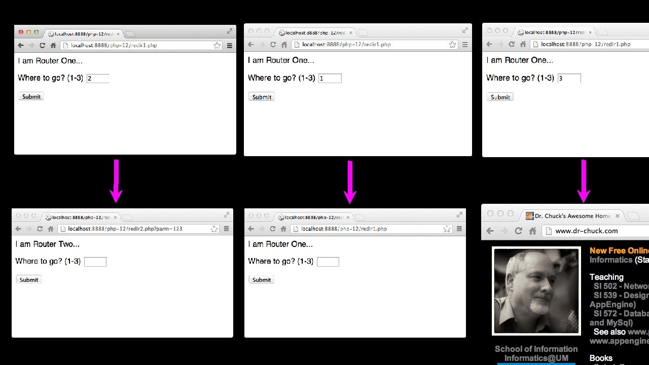 <? php session_start(); if ( isset($_POST['where']) ) { if ( $_POST['where'] == '1' ) { header("Location: redir 1. php"); return; } else if ( $_POST['where'] == '2' ) { header("Location: redir 2. php? parm=123"); return; } else { header("Location: http: //www. dr-chuck. com"); return; } } ? > <html> <body style="font-family: sans-serif; "> <p>I am Router Two. . . </p> <form method="post"> <p><label for="inp 9">Where to go? (1 -3)</label> <input type="text" name="where" id="inp 9" size="5"></p> <input type="submit"/></form> </body> redir 1. php
