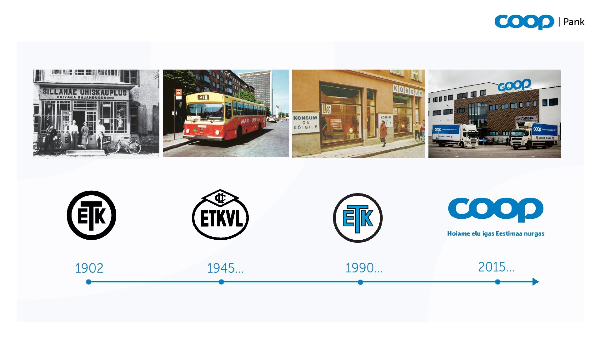 Kes me oleme • Coop Pank on eestimaine pank • Näeme panga klientidena kõiki eestimaalasi • Meie tegevuspiirkond on Eesti ja keskendume eelkõige väljaspoole suurlinnu • Pakume klientidele kõiki vajalike pangatooteid • Teenindame klienti pangakontorites, Coop kaupluste võrgus ja e-kanalites • Soovime anda oma panuse Eesti ettevõtluskeskkonna ja majanduse arengusse 2017. aasta sügisel Eesti pangandussektorisse lisandunud Coop Pank on loodud sünergias Eesti suurima jaekaubandusketiga Coop Eesti.