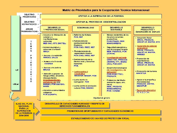 ÁREAS PRIORITARIAS DE COOPERACIÓN HACIA EL PERÚ 1. Lucha contra la pobreza 2. Apoyo al sector social 3. Ordenamiento de la base económica 4. Conservación del medio ambiente
