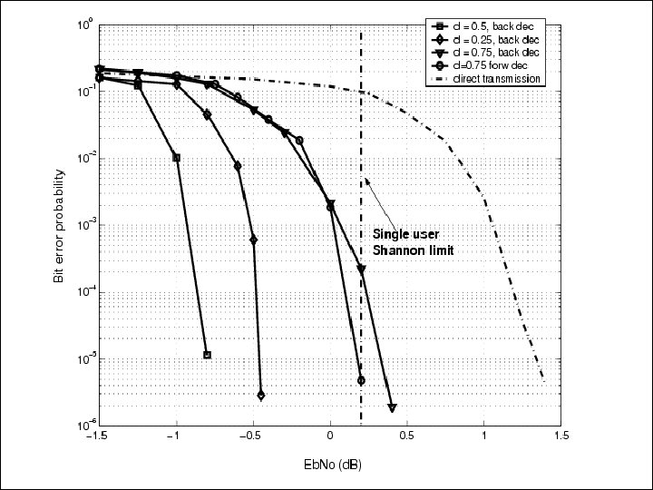 Coding for Relay Channels u u u A hybrid relay protocol – Estimate and Forward and Decode and Forward Constituent codes – LDPC – Irregular Performance 1 d. B away from Shannon limit and 0. 2 d. B better than single link Shannon limit – Code length 20, 000 and number of blocks 40