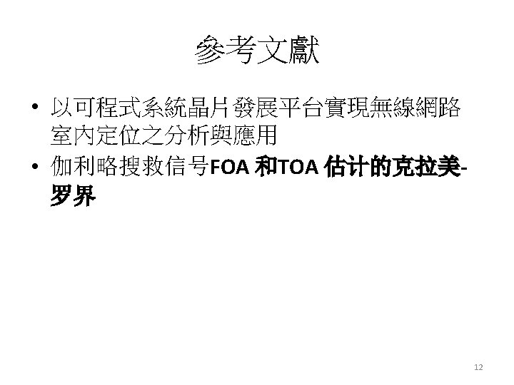CONCLUSION • Cooperative localization research will continue to grow as sensor networks are deployed in larger numbers and as applications become more varied. • We have presented measurement based statistical models of TOA, AOA, and RSS, and used them to generate localization performance bounds. 11