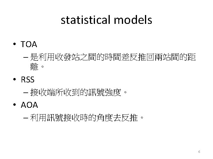 INTRODUCTION • Accurate and low-cost sensor localization is a critical requirement for the deployment of wireless sensor networks in a wide variety of applications. • we describe measurement-based statistical models useful to describe time-of-arrival (TOA), angle-of-arrival (AOA), and receivedsignal-strength (RSS) measurements in wireless sensor networks. 3