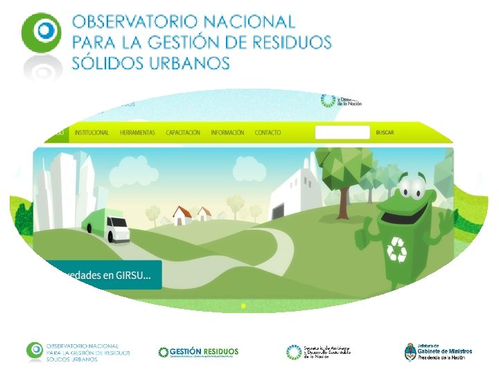 Observatorio Nacional para la GIRSU ¿Qué es? Es un espacio diseñado para promover la GIRSU en el territorio nacional a través de la generación de información, la capacitación y la difusión de herramientas para fortalecer la gestión local; ¿Cuáles son sus objetivos? ü Brindar información acerca del esquema institucional que ofrece el Estado Nacional para la promoción y la implementación de la ENGIRSU. ü Desarrollar herramientas que propicien la generación e intercambio de información, favoreciendo la articulación con gobiernos locales e instituciones y organizaciones involucradas en la temática; ü Promover la capacitación de recursos humanos para facilitar la implementación y sostenibilidad de las iniciativas de GIRSU; ü Sistematizar la información ambiental existente en materia de GIRSU, impulsando la promoción de líneas de trabajo e investigación, y garantizando la difusión, socialización y extensión de los conocimientos obtenidos.