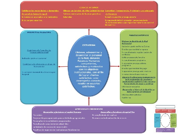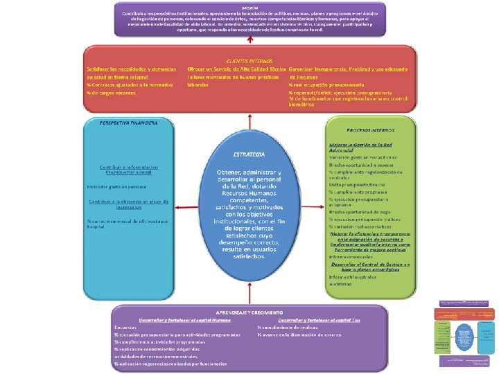 CLIENTE PROCESOS INTERNOS Satisfacer las necesidades y demandas de salud de forma integral Mejorar la gestión de la red asistencial APRENDIZAJE Y CRECIMIENTO Garantizar transparencia, probidad y uso adecuado de recursos Otorgar un servicio de alta calidad técnica Mejorar la eficiencia y transparencia en la asignación de recursos e implementar auditoría interna como herramienta de mejora continua Desarrollar el control de gestión en base a planes estratégicos Desarrollar y fortalecer el capital humano Desarrollar y fortalecer el capital TICs Sustentabilidad financiera FINANCIERA Contribuir a la formulación presupuestaria anual Como contribuyo por perspectivas Contribuir a la eficiencia en el uso de los recursos