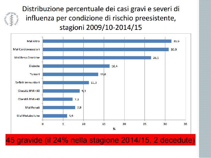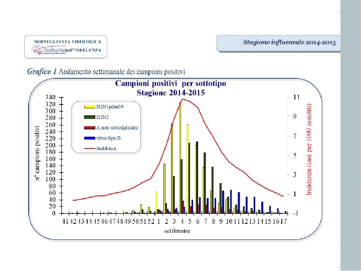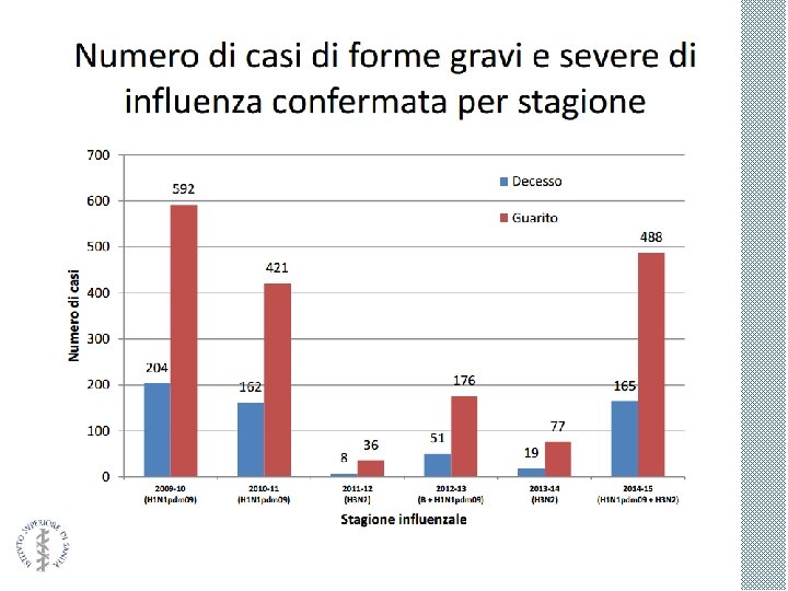 Stagione Numero vaccinati ogni 100 abitanti Numero vaccinati over 65 ogni 100 abitanti Numero casi accertati 2014 -2015 13, 6 49, 0 6. 299. 000 2013 -2014 15, 6 55, 6 4. 542. 000 2012 -2013 14, 9 54, 2 5. 995. 000 Bilan cio st ag riduz ione d ione influ en i di 6 p unti s 2 punti de zale 2014 -2 ll ugli o ver 65 a copertu 015: 1. 75 ra vac 7 !! cinale. 000 casi i n sulla popo più con un lazion a e gen erale Fonte: Dati ISS – Ministero della Salute e