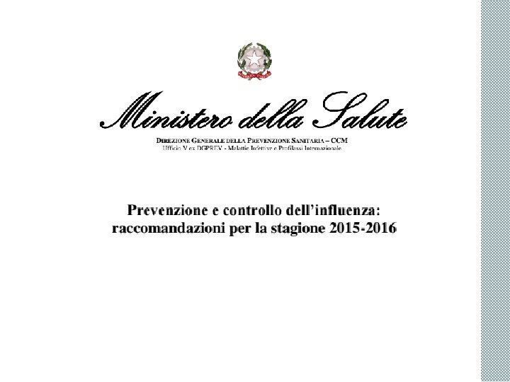VACCINO ANTINFLUENZALE 2015 Ø Trivalente: ü H 3 N 2 ceppo A/Switzerland/9715293/2013 sostituirà A/Texas/50/2012 ü AH 1 N 1 pdm 09 rimarrà immutato ü B/Phuket/3073/2013 sostituisce B/Massachusetts/2/2012 (stesso lineaggio B/Yamagata/16/88) Ø Quadrivalente: ü Contiene antigeni di ulteriore virus ceppo B/Brisbane/60/2008 -like (lineaggio B/Victoria/2/87)