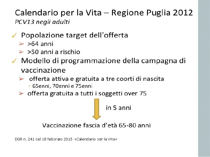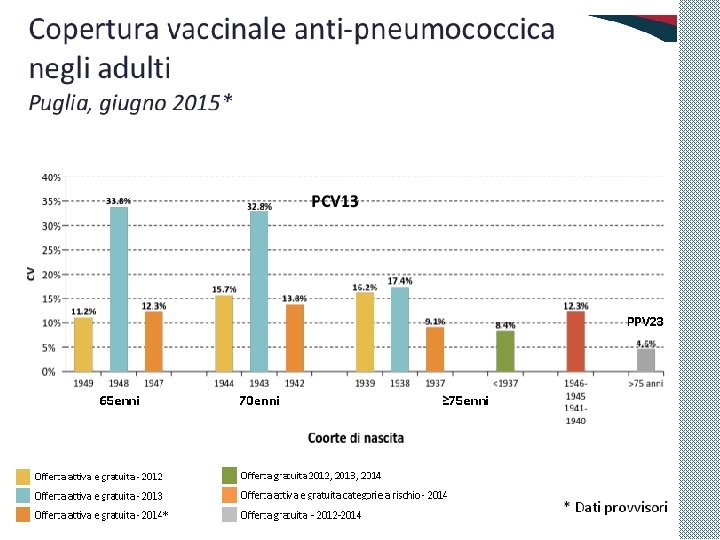 Vaccinazione antipneumococcica nei soggetti adulti: N. dosi di PCV 13 somministrate nel periodo 2012 -2014 ASL Lecce Coorti target offerta (DGR 958/2014) Anno di nascita Popolazione N. Soggetti vaccinati CV 65 anni 1949 10259 104 1, 0 66 anni 1948 10030 1447 14, 4 67 anni 1947 10829 1462 13, 5 70 anni 1944 8391 264 3, 1 71 anni 1943 7566 1330 17, 6 72 anni 1942 8186 1305 15, 9 75 anni 1939 8065 359 4, 5 76 anni 1938 8521 590 6, 9 77 anni 1937 8042 733 9, 1 >77 anni <1937 74889 4168 5, 6