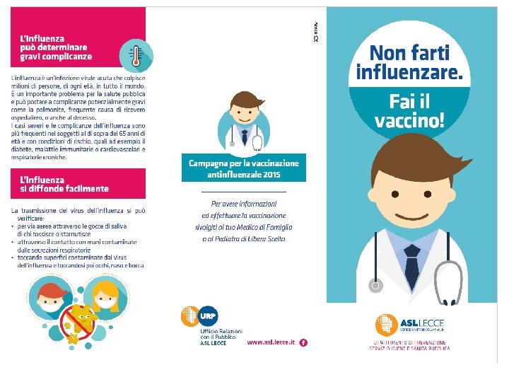 ASL LECCE - Campagna vaccinale 2013 – 2014 Tipi di Vaccino: - Fluad MF 59 (vaccino adiuvato) - autorizzato per l’immunizzazione dei soggetti di età ≥ 65 anni (soggetti anziani e affetti da patologie croniche) - Influvac S (vaccino antigene di superficie inattivato): - indicato per adulti e bambini sopra i 36 mesi - Intanza 15 mg (vaccino intradermico): - indicato negli adulti di età ≥ 60 anni – specie per i soggetti di età tra 60 e 70 anni -Fluarix Tetra (virus split inattivato) - indicato nei soggetti adulti e bambini a partire dai 36 mesi di età