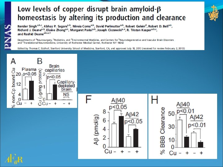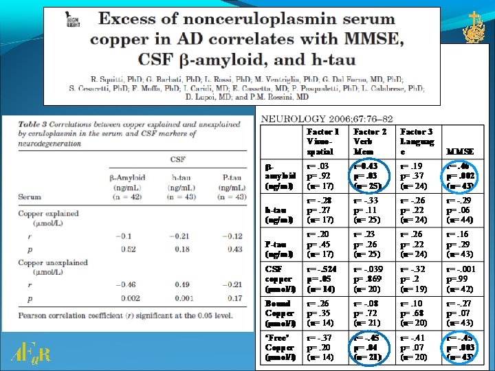 AD copper subtype: 12 years of evidence 2002 Squitti et al. , Elevation of serum copper levels in Alzheimer's disease - Neurology 2003 Squitti et al. , Elevation of serum copper levels discriminates Alzheimer's disease from vascular dementia - Neurology 2005 Squitti et al. , Excess of serum copper not related to ceruloplasmin in Alzheimer disease - Neurology 2006 Squitti et al. , Excess of nonceruloplasmin serum copper in AD correlates with MMSE, CSF [beta]-amyloid, and h-tau - Neurology 2007 Babiloni et al. , Free copper and resting temporal EEG rhythms correlate across healthy, mild cognitive impairment, and Alzheimer's disease subjects - Clin Neurophysiol 2007 Squitti et al. , 'Free' copper in serum of Alzheimer's disease patients correlates with markers of liver function - J Neural Transm 2008 Squitti et al. , Ceruloplasmin fragmentation is implicated in 'free' copper deregulation of Alzheimer's disease - Prion 2009 Squitti et al. , Longitudinal prognostic value of serum "free" copper in patients with Alzheimer disease - Neurology 2014 Squitti R et al, Value of serum non-ceruloplasmin copper for prediction of MCI conversion to AD. Ann Neurol