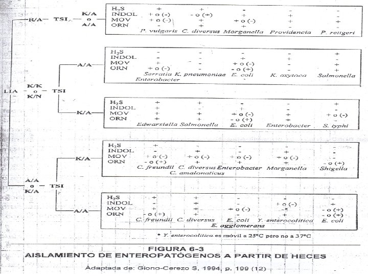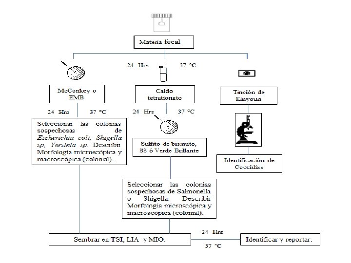 Diagrama de flujo para el diagnóstico de infecciones gastrointestinales. Materia Agua peptonada TCBS Seleccionar colonias amarillas y sembrar en TSI, LIA, MIO, caldo peptonado y arginina Reacción de aglutinación con suero anti Vibrio cholerae O 1 Campy-Bap Seleccionar colonias y sembrar en TSI, Hacer pruebas de acetato de plomo y de hidrólisis de hipurato Campylobacter Mc. Conkey o EMB Seleccionar colonias y sembrar TSI, LIA y MIO Reacciones de aglutinación con sueros anti A, B, C y D de Shigella Escherichia coli Tipificar con antisueros Yersinia fecal Caldo tetrationato Pruebas rápidas Tinción de Kinyoun Coproparistoscópico Sulfito de bismuto, SS ó Verde Brillante Seleccionar colonias y sembrar en TSI, LIA y MIO Tipificación de Salmonella con sueros anti A, B, C 1, C 2, D y E Identificación de Coccidias Detección de Rotavirus Identificación de quistes de protozoarios , huevecillos y larvas de helmintos Adaptado de: Diagnóstico de Laboratorio de infecciones gastrointestinales. INDRE pp 205