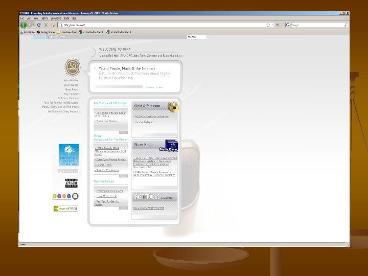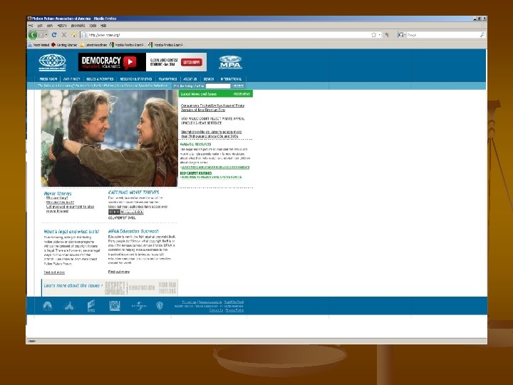 Anatomy of a Pirate Where is infringement taking place? On Line Peer to Peer (P 2 P) – n Napster. (no Longer in use) Material resides on the computers of the users. The content files do not go to a centralized server or website. Users download software that allows them to locate the files on the computers connected via the Internet. Napster had a centralized data base on servers Napster maintained to help users locate files on other users’ computers. The Ninth Circuit ruled that Napster was secondarily liable for the infringing activity because they could control the piracy by controlling the centralized index server.