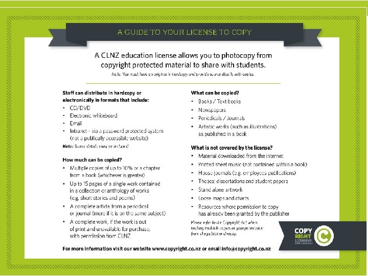 When does Copyright Apply? • It is automatic! • The © symbol is only a reminder • No registration required in NZ • Automatically applies to original writing, computer programmes, drama, music, art, sound recordings, films, TV and radio broadcasts
