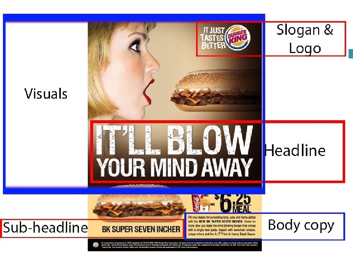 Elements of an Advertisement 1. 2. 3. 4. Headline: To get your attention and draw you to the subheadline. Subheadline: To give you more information and further explain the attention-getting headline. Photo or Drawing: To get your attention and to illustrate the product more fully. Caption: To describe the photo or drawing. This is an important element and one that is often read.
