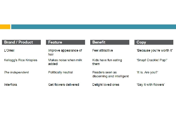 Slogans/ Taglines Slogans are one-line promises of value. The value might be boldly stated or subtly shaded, but it has to be both clear and believable. In some advertisements, the slogan may be the only content.