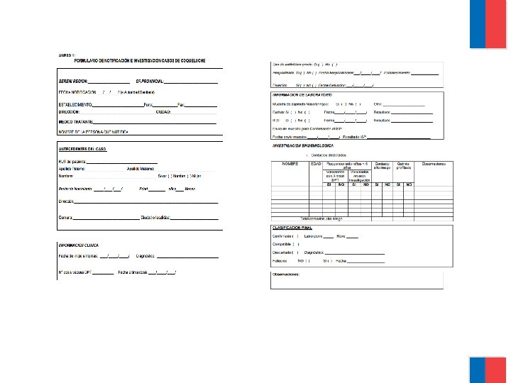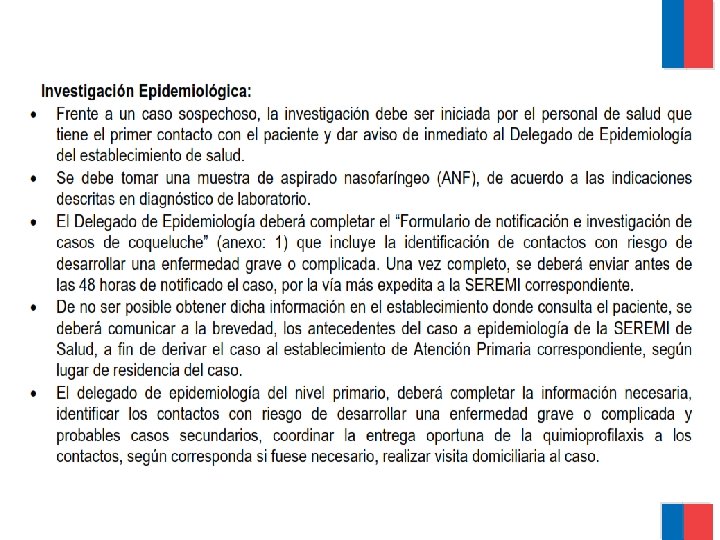 DESAFÍOS NIVEL REGIONAL • Frente a un caso sospechoso, la investigación debe ser iniciada por el personal de salud que tiene el primer contacto con el paciente y dar aviso de inmediato al Delegado de Epidemiología del establecimiento de salud. • El Delegado de Epidemiología deberá completar el “Formulario de notificación e investigación de casos de coqueluche nuevo” (anexo: 1) que incluye la identificación de contactos con riesgo de desarrollar una enfermedad grave o complicada. Una vez completo, se deberá enviar antes de las 48 horas de notificado el caso, por la vía más expedita a la SEREMI. “TODO COMO SI FUERA PATOLGIA DE NOTIFICACION INMEDIATA”