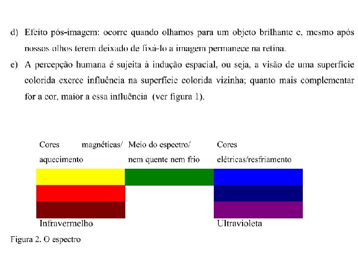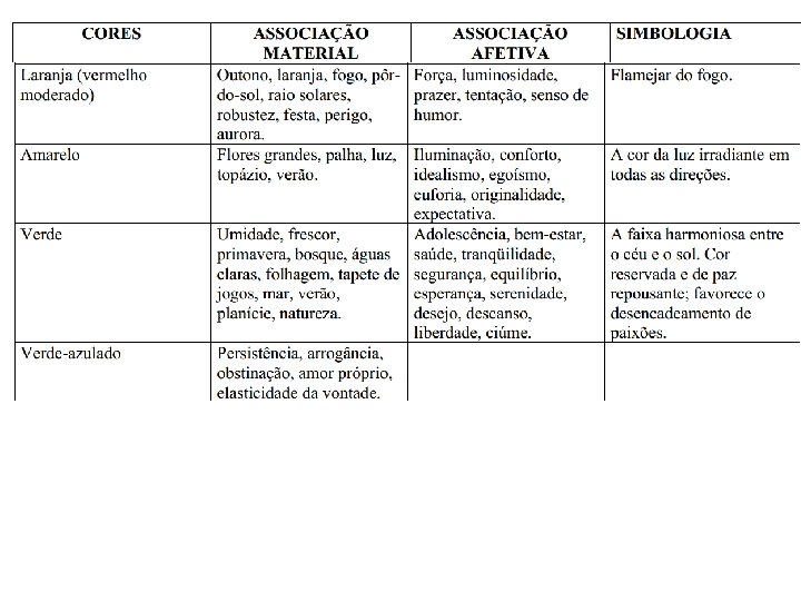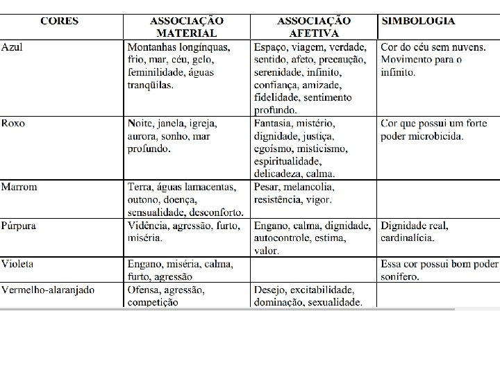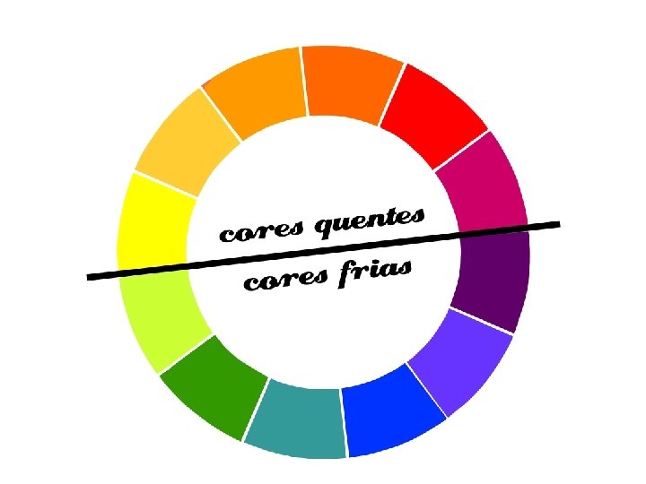 As cores quentes são associadas ao sol e ao fogo: amarelo, laranja e vermelho. São aquelas que nos transmitem a sensação de calor. As cores frias são associadas à água, ao gelo, ao céu e às árvores: violeta azul e verde. São aquelas que nos transmitem sensação de frio. As cores quentes são consideradas excitantes e as cores frias calmantes.