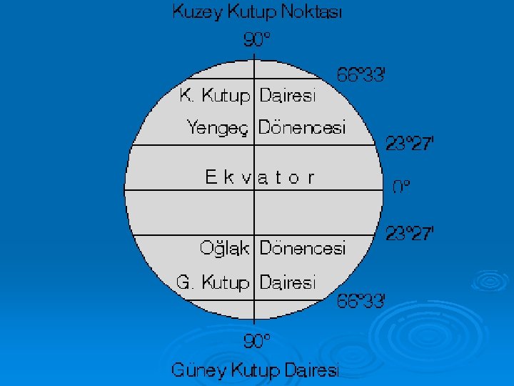 PARALEL (ENLEM) SONUÇLARI Ø Güneş ışınlarının düşme açısı, Ø Sıcaklığın Ekvatordan Kutuplara azalması, Ø İklimlerin değişmesini(Sıcak, Ilıman, Soğuk) Ø Ekvatordan kutuplara gidildikçe gece gündüz süre farkının artması (Ekvatorda 12 saat gündüz, 12 saat gece vardır) Ø Kuzey yarım kürede güneyden esen rüzgarlar sıcaklığı yükseltir. Ø Ekvatora yakın yerlerde meridyenler arası mesafe fazla olduğundan yüz ölçüm fazla.