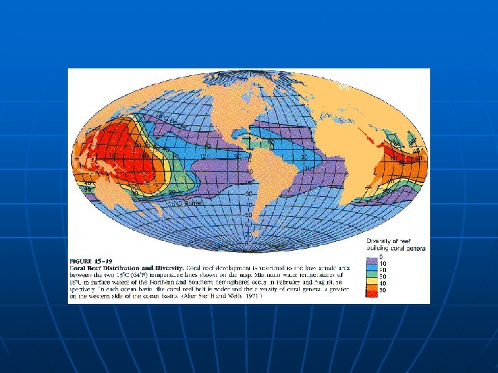 n Coral reefs are scattered over 190, 000 km 2 of Earth’s surface • The total area inhabited by coral reefs has expanded and contracted with global climate and sea level changes n For example, in the Devonian (ca. 400– 350 Mybp), coral reefs covered 540, 000 km 2 • The distribution of corals is pantropical