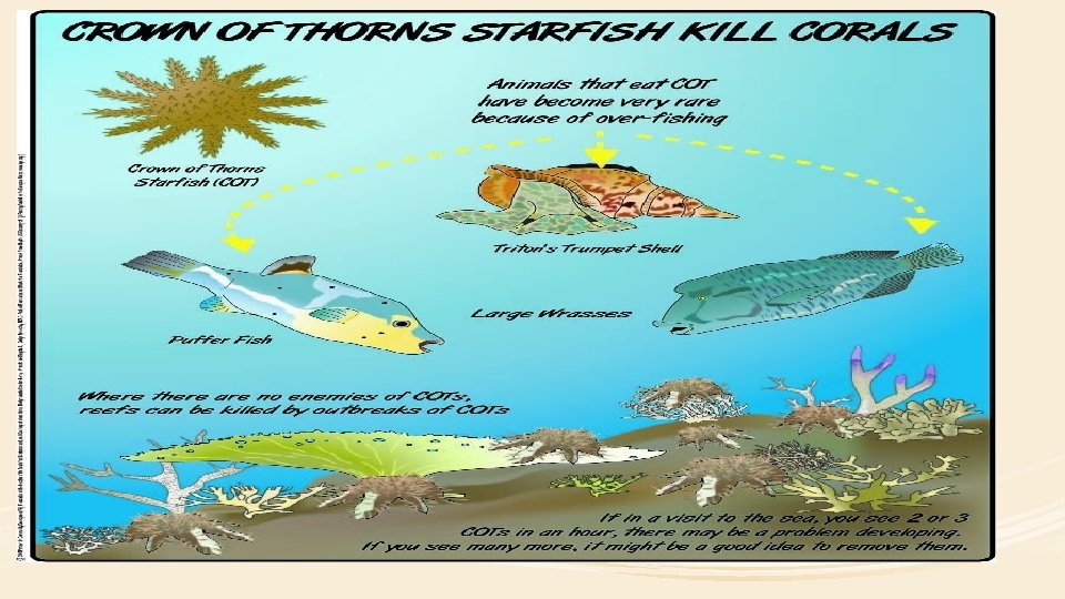 Destruction of reefs • Predation Crown of Thorn starfish • Parrotfish •