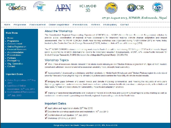 WCRP CORDEX South Asia Training Workshop In partnership with CCCR-IITM, START, ICTP, CSAG, SMHI and ICSUROAP 17 – 20 October 2012, Pune, India http: //cccr. tropmet. res. in/cccr/home/CORDEX/oct 2012/index. ht ml