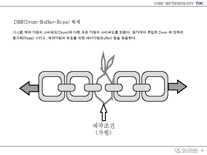 CORE METHODOLOGY TOC 2. TOC Methodology TOC의 성공적 구축을 위해서는 제약 자원에 대한 DBR(Drum-Buffer-Rope) Concept를 설정하고 거기에 따른 Buffer 설정 및 Solution의 설계와 개발의 단계가 진행되게 된다. DBR 개념의 도입은 기업의 APS(Advanced Planning & Scheduling) 구축이 가능하게 하며 전사적TOC성과 측정지표로서 Throughput Accounting 체계가 도입된다. 정책적 제 약은 Thinking Process의 CRT, EC, FRT, PT, TT 의 방법론을, 프로젝트 관리는 프로젝트 프로세스에 존재하는 제약 자원을 관리하는 Critical Chain 방법론을 활용한다. 이들 모듈은 모두 TOC Concept에 근거하여 개발되어 왔다. 1. Consensus Phase 0 Consensus • Project Scope 결정 • Project 목표 결정 • 컨센서스 형성 2. Development of Constraint Specific Solution for Operations(CSS) Phase I DBR concepts • Project Team 구축 • TOC/DBR 시스템의 이해 • DBR시스템 훈련 Phase Ⅱ Design & Development (솔루션 정의) • Modeling • 제약의 결정 • Buffer의 결정/설계 3. Implementation of Constraint Specific Solution for Operations(CSS 의 실행) Phase V Continuous improvements (지속적 개선과정 실행) • 내부 TOC 전문가 • Thinking Process • Critical Chain Phase Ⅳ Expand (솔루션의 실행을 조직 단위로 확산 전개) • 바람직한 규칙정의 • 실행계획 수립/조치 l Phase V의 Thinking Process 와 Critical Chain 은 필요에 따라 다른 Phase 독립적으로 운용될 수 있음. Phase Ⅲ Implementation • Pilot 실행 • APS/Throughput Accounting • 문제점 발굴/대응 3 3