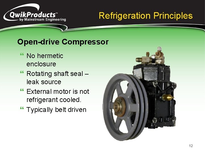 Refrigeration Principles Open-drive Compressor } No hermetic enclosure } Rotating shaft seal – leak source } External motor is not refrigerant cooled. } Typically belt driven 12