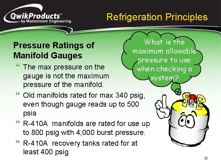 Refrigeration Principles Gauge Color Codes } Blue—Low pressure } Red—High pressure } Yellow—Center 25
