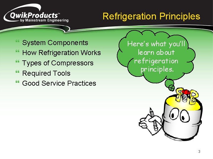 Core Section Environmentally Safe Refrigerant Service Tips & Techniques Week 3 Refrigeration Principles © 2018 Mainstream Engineering Corporation Qwik System Flush®, Qwik. Check, Qwik. Injector®, Qwik-SF®, Qwik. Shot®, are registered trademarks and Qwik 609™ and Qwik. Products™ are trademarks of Mainstream Engineering Corporation, Rockledge, Florida. 1