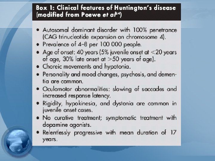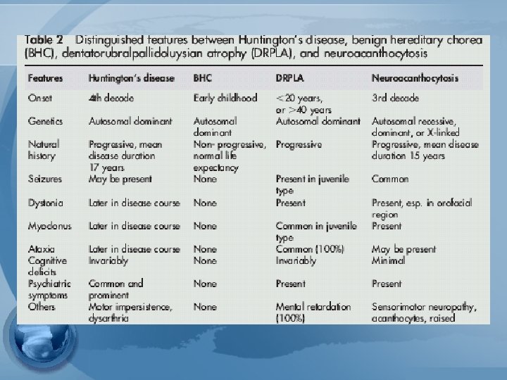 Huntington`s disease: • • Causa más común de corea 1 - Naturaleza hereditaria 2 - Tendencia a “insanidad” y suicidio 3 - grave en vida adulta. • (*** Será objeto de próxima presentación)