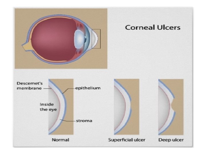 STAGES OF CORNEAL ULCER Progressive stage ulcer is saucer- shaped over-hanging edges floor has necrotic material grey zone of infiltration surrounding edema