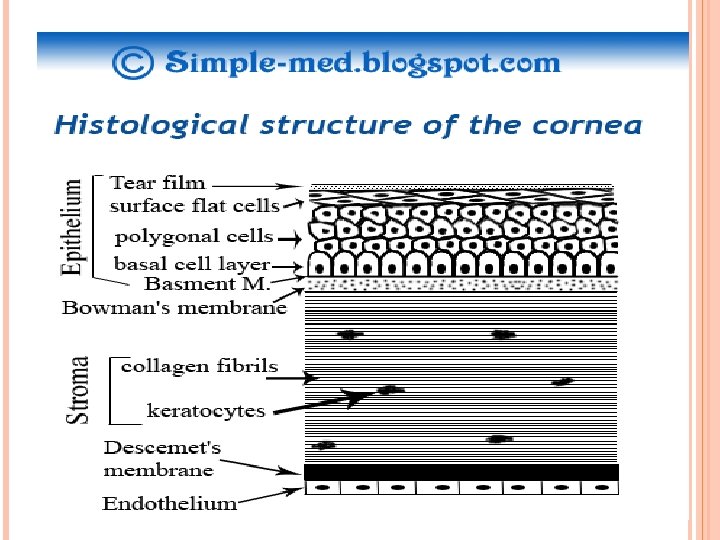 Corneal Diameter (mm) Horizontal Radius of curvature Vertical Anterior 11. 7 10. 6 7. 8 Posterior 11. 7 6. 5 Central Corneal Thickness (mm) 0. 5 -0. 6 Peripheral 1. 2
