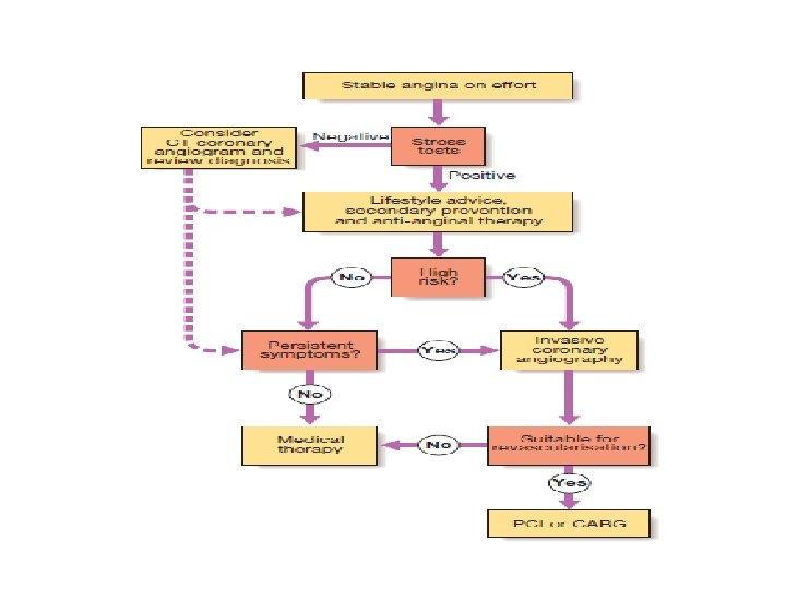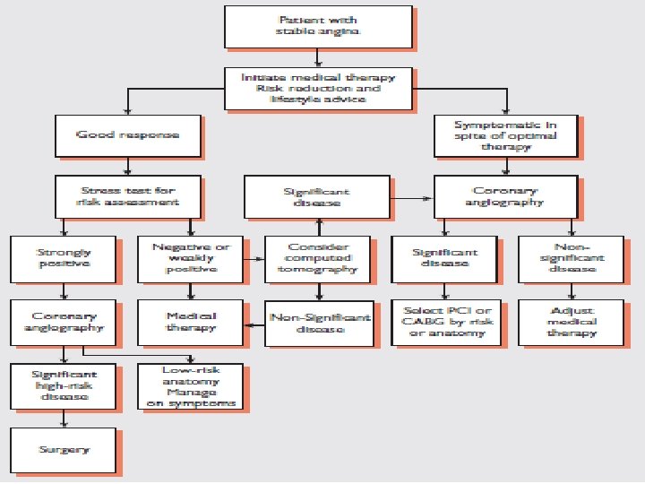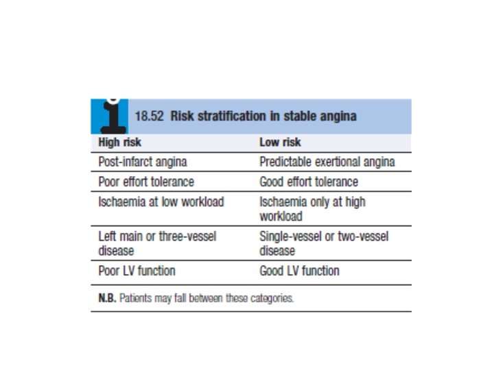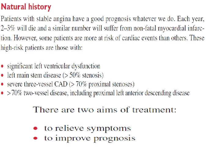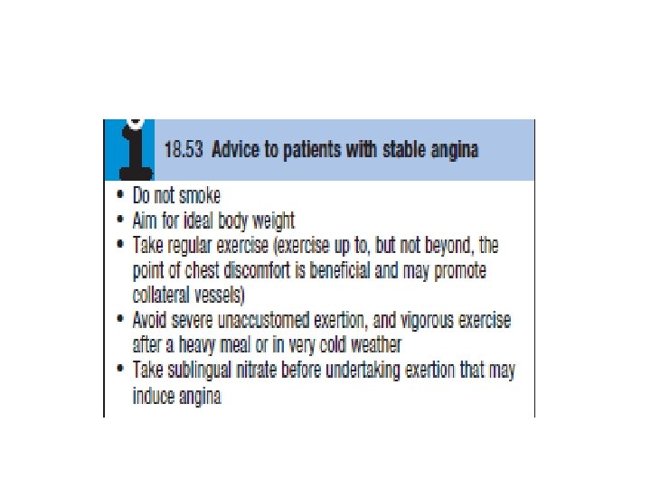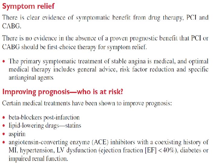 Management Lifestyle Smoking cessation is of paramount importance. Encourage daily aerobic exercise within limits of exercise capacity. Look at the patient’s occupational needs and advise adjustment if symptom level is not compatible. Advise a healthy diet, collaborating with dieticians if required. Aspirin Provide aspirin in all cases unless there is active peptic ulcer disease, allergy (desensitizing may be required), or bleeding diathesis. Those with past peptic ulcer disease may take a gastro protective agent such as an H 2 antagonist or proton pump inhibitor. Anti-anginals • B-Blockers: First line (e. g. , atenolol 25– 100 mg qd or metoprolol 25– 50 mg bid). Start on suspicion of ischemic heart disease. Avoid only if contraindicated (asthma with confirmed B-agonist response (mortality improved in patients with angina and concomitant COPD if they can tolerate bronchospasm), uncontrolled severe LV dysfunction, bradycardia, coronary artery spasm). • Calcium antagonists (e. g. , amlodipine or diltiazem): If B-blocker contraindicated or concern for vasospasm, calcium antagonists become the drug of choice. • Nitrates (e. g. , nitroglycerin): Used for control of breakthrough angina. Long-acting nitrates (e. g. , isosorbide mononitrate 60– 120 mg qd) are a useful addition to B-blockers for prevention of attacks. . Statins (HMG-Co. A reductase inhibitors) reduce mortality by approximately one-third in all risk groups. However, the underlying risk of events must be taken into account when considering starting the drug, because absolute risk reduction in young patients with low-risk IHD may be very small, with possible harm of myositis, hepatic failure, and reduced compliance with other medications