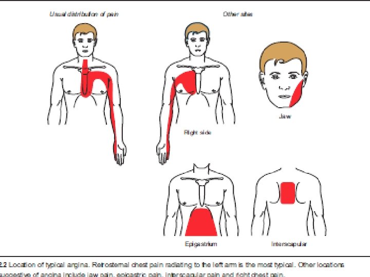 History and examination Angina pectoris is characterized by a deep and diffusely distributed central chest discomfort. Certain features of pain are of discriminative value. Patients will not be able to point to where the pain is coming from with one finger but will use an open palm or fist over the center or left parasternal aspect of their chest ( Levin s sign ). • The pain is not sharp (some patients confuse “sharp” with “severe”). • Pain lasts longer than a few seconds and rarely exceeds an hour without varying in severity. Most episodes will last 1– 5 minutes. • The response to nitroglycerin, if any, will be almost immediate. Generally, responses taking more than 5 minutes are unlikely to be related to the drug. Angina equivalent symptoms -Dyspnea, fatigue, nausea, and recurrent belching may also represent underlying ischemia and can occur in the absence of the classical central chest pain. The clue to underlying ischemic heart disease (IHD) lies in their precipitation by exertion or emotional stress. • Chest wall tenderness suggests musculoskeletal pain and does not accompany angina.