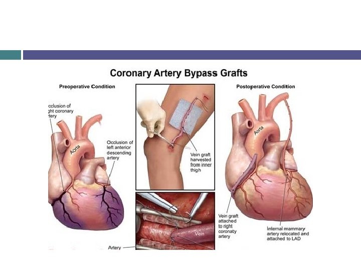 Indications for open-heart surgery Coronary Artery Bypass Grafting: (CABG) Triple vessel disease Lf main coronary artery disease Unstable angina , failed Mx therapy Complications of PTCA Life threatening complications of MI Anomalies of Coronary arteries.