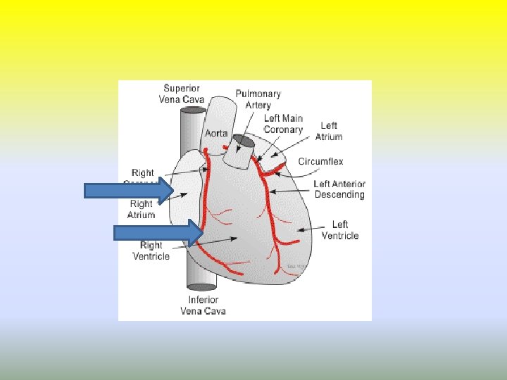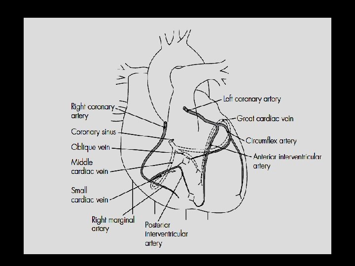Right Coronary Artery (RCA) • • • The right coronary artery branches into: Right marginal artery Posterior descending artery The right coronary artery supplies: Right atrium ● Part of the left atrium ● Right ventricle ● Posterior interventricular septum ● Sino-atrial node (in 60%) ● Atrioventricular node (in 80%)
