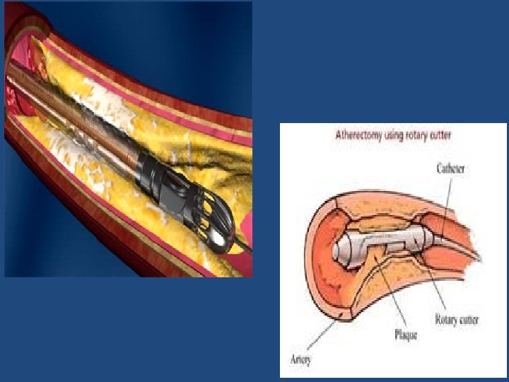 Atherectomy • Remove plaque from the identified lesion • Catheter shaves the plaque off vessels walls using a rotary cutting head - retaining the fragments in it compartment and removing them from the vessel. • Rotation catheter pulverize the plaque into particles small enough to pass through the coronary microcirculation.