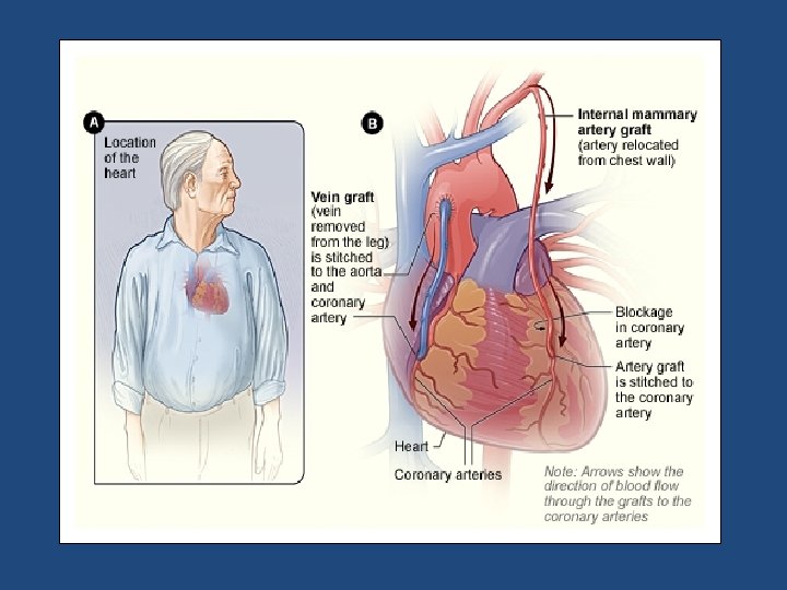 CABG • Involves using a section of a vein /artery to create a connection (bypass) between the aorta and the coronary artery beyond construction. • This allows blood to perfuse the ischemic portion of the heart. • Internal mammary artery in the chest/saphenous vein from the leg are the vessels most commonly used.