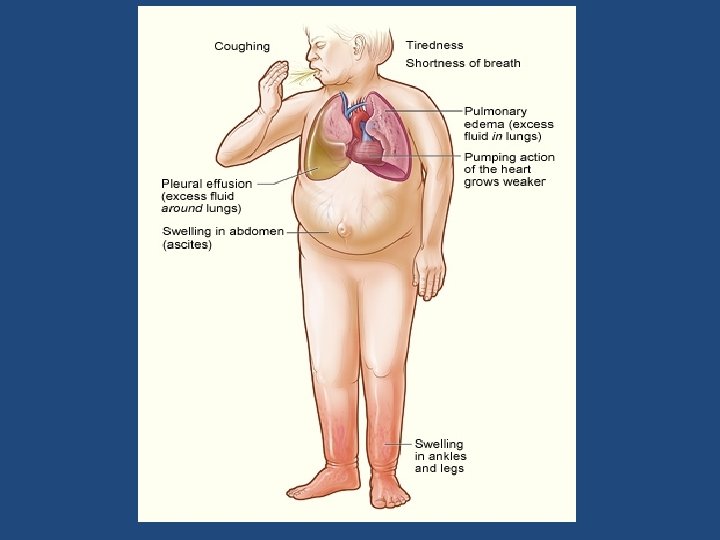 Manifestations of Heart Failure • CHD/hypertension are common causes of L-sided heart failure whereas R- heart failure caused by conditions that restrict blood flow to the lungs (acute/chronic pulmonary disease). Left sided heart failure can lead to right sided heart failure.